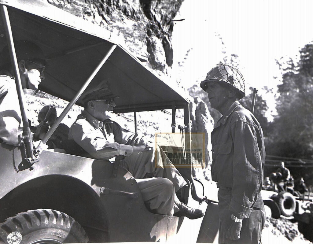 Five-star General Douglas MacArthur halts his jeep along the road outside Bamban, Luzon Island, PI, to speak to Major General Rapp Brush, commanding the 40th Infantry Division. Sitting in the back of the jeep is Colonel Lloyd Lehrbas, the general’s aide.”